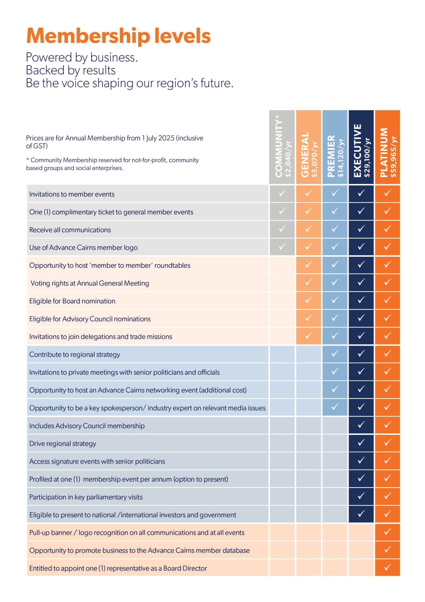 The extent of your engagement is ultimately up to you, but this is an opportunity to be part of major strategic discussions that are shaping our region’s future. Advance Cairns membership is more than a subscription—it’s an investment in influence, outcomes and the future of Far North Queensland.